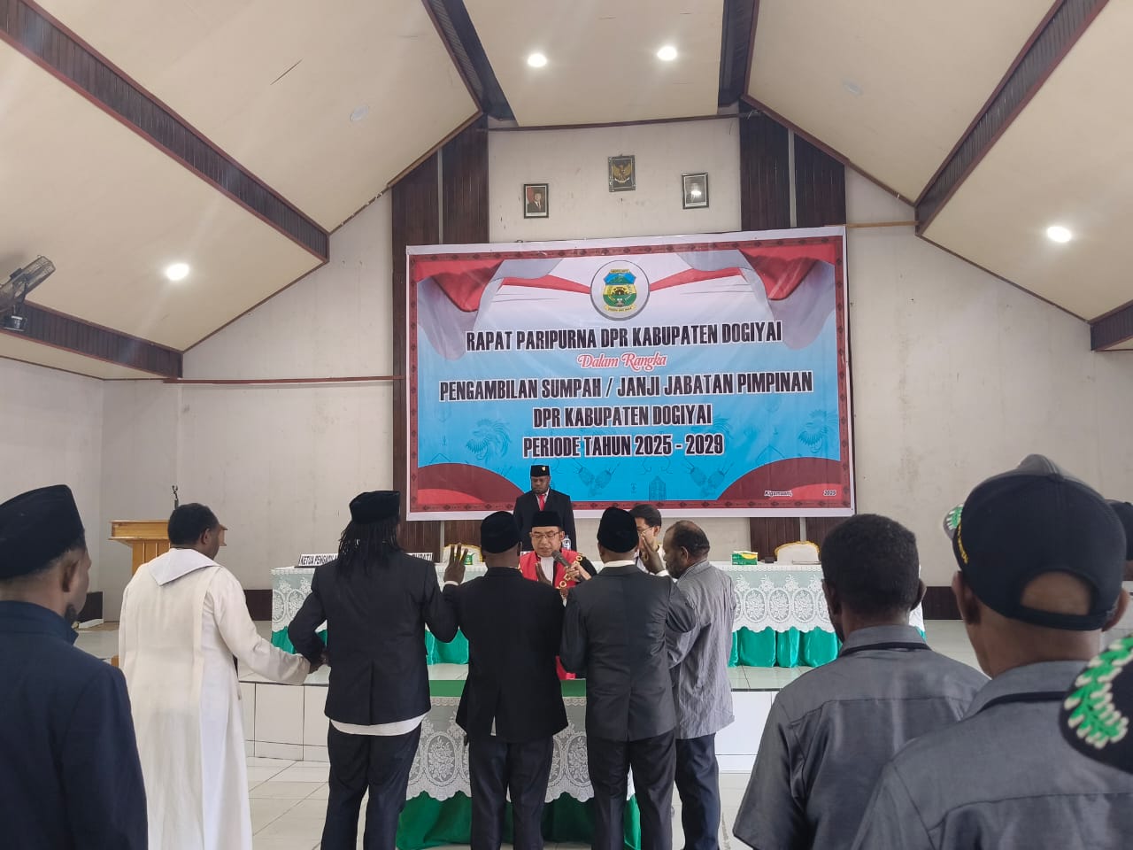 Sekertaris DPRK Kabupaten Dogiyai, MAX YoOBE, S.H mengatakan Pelantikan dan Pengambilan Sumpah dan Janji jabatan pimpinan DPRK Kabupaten Dogiyi ini ditetapkan berdasarkan Surat Keputusan Gubernur Papua Tengah Nomor 100.3.3.1/166 tentang Peresmian Pimpinan DPRK Dogiyai Periode 2025–2029.
